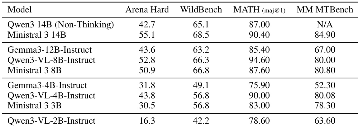 The authors compare Ministral 3 Instruct models to instruction-tuned baselines from the Qwen 3 and Gemma 3 families, showing that Ministral 3 14B outperforms Qwen3 14B (Non-Thinking) and Gemma3-12B-Instruct on Arena Hard, WildBench, and MATH, while also achieving higher scores than Qwen3-VL-8B-Instruct on most benchmarks. At smaller scales, Ministral 3 8B and 3B models are competitive with Qwen3-VL variants, demonstrating strong performance relative to their size, particularly on MATH and MM MTBench.