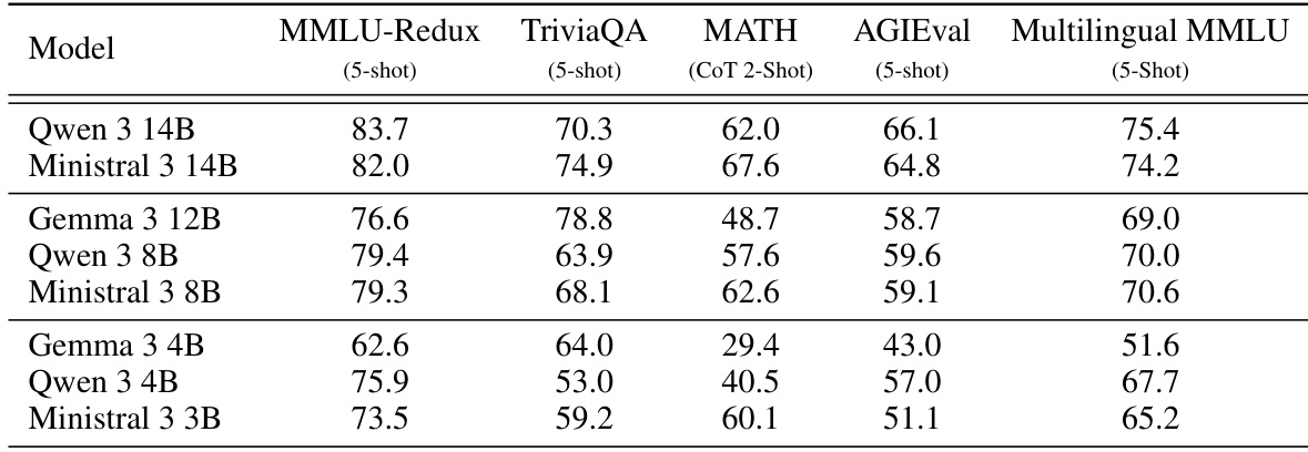 Evaluations show that Ministral 3 models achieve competitive performance on standard benchmarks, matching or exceeding similarly sized open models like Gemma 3 and Qwen 3, with the 14B Base model outperforming its larger parent in efficiency while maintaining strong reasoning and instruction-following capabilities.
