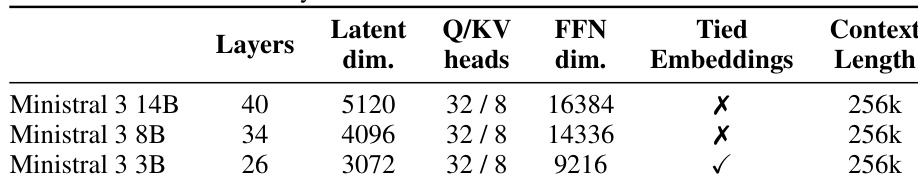 The authors use a consistent architecture across Ministral 3 models, with varying numbers of layers, latent dimensions, and feed-forward network dimensions, while maintaining a fixed context length of 256k tokens. The 3B variant includes tied embeddings, which is not present in the larger 8B and 14B models, and all models share the same Q/KV head configuration of 32/8.