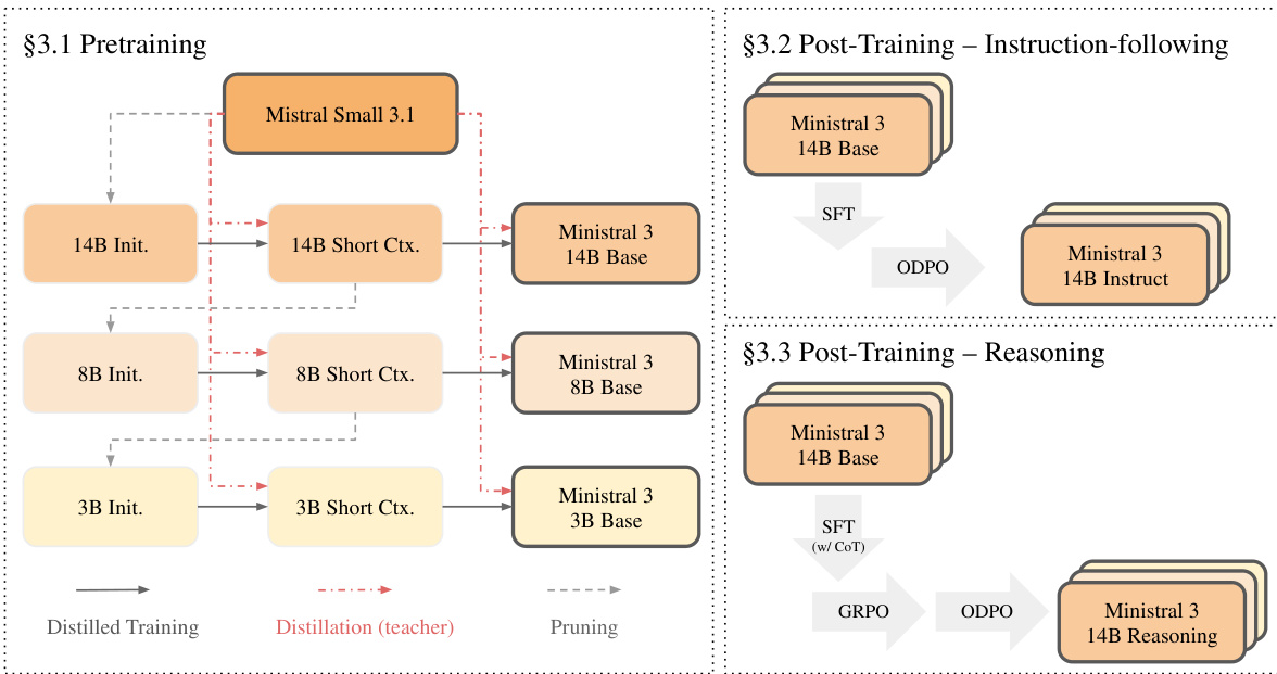 The Ministral 3 models are constructed using a hierarchical training framework that begins with a large parent model and iteratively derives smaller, more efficient variants through a process termed Cascade Distillation. This approach enables the creation of three model sizes—3B, 8B, and 14B parameters—each available in base, instruction-following, and reasoning variants, all derived from the Mistral Small 3.1 model. The overall training pipeline consists of a pretraining phase followed by two distinct post-training stages for instruction-following and reasoning capabilities.