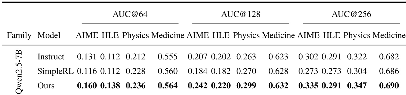 The authors use AUC@K to evaluate the accuracy-coverage trade-off across different models and domains, with higher values indicating better performance. Results show that the proposed method (OURS) consistently achieves the highest AUC@K across all budgets (64, 128, 256) and domains (AIME, HLE, Physics, Medicine) on the Qwen2.5-7B model, outperforming both the Instruct baseline and the SimpleRL baseline, with the largest gains observed in the more challenging AIME and HLE settings.