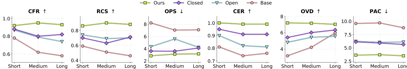 Results show that the proposed method achieves superior performance across multiple metrics compared to baseline models. It consistently outperforms the Open and Base models in layout design, object placement, and visual-semantic consistency, particularly on longer instructions, while maintaining stable performance across varying input lengths. The method also demonstrates robustness in handling complex spatial reasoning tasks, with significant improvements in metrics such as Collision-Free Rate, Room Connectivity Score, and Object Volume Density.