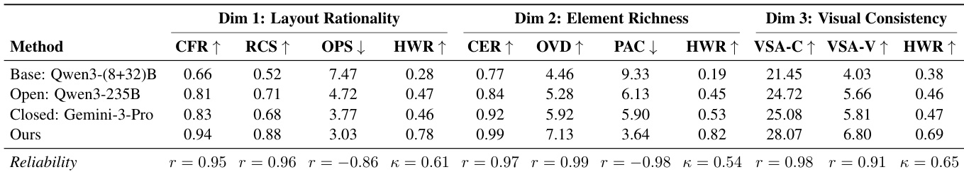 The authors use a two-stage framework to evaluate scene generation models, comparing their method against Qwen3-235B and Gemini-3-Pro across layout rationality, element richness, and visual consistency. Results show that their approach achieves the highest scores in layout rationality and visual consistency, with strong reliability across metrics, while also demonstrating superior performance in element richness compared to the open and closed baselines.