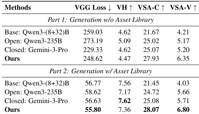 - Ablation showed asset library critical for visual harmony (VH ↑, VGG loss ↓); removal degrades VSA-V but not VSA-C, confirming style consistency aids VLM judgment.