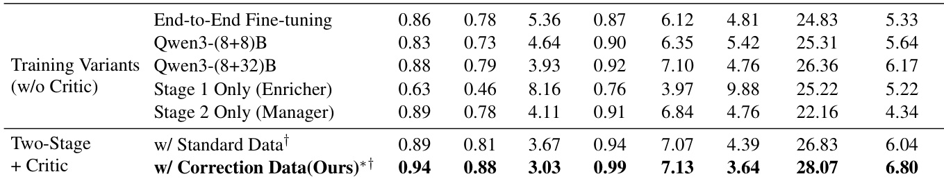 The authors use a two-stage training strategy to improve scene generation, with the inclusion of a critic module and correction data significantly enhancing performance across layout and element design metrics. Results show that the proposed method, trained on correction data, achieves the highest scores in all evaluated dimensions, demonstrating the effectiveness of iterative refinement and the importance of domain-specific training.