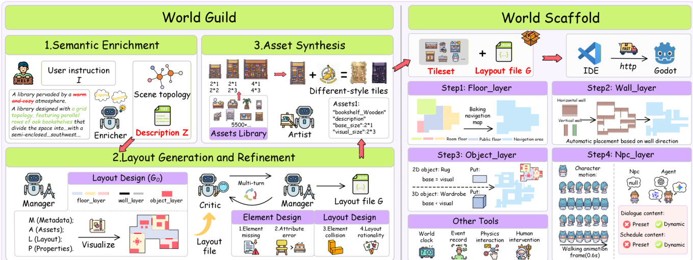 - World Guild employs multi-agent reasoning to bridge the semantic gap between vague user descriptions and precise spatial layouts, while World Scaffold provides a standardized interface for LLMs to construct interactive scenes, supported by a curated asset library to ensure physical and visual consistency.