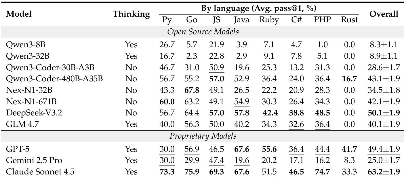 - Performance varies significantly by language stack: Rust tasks are particularly challenging, with most models failing (e.g., DeepSeek-V3.2 at 0.0%), while only top proprietary models (Claude Sonnet 4.5, GPT-5) exceed 30% success.