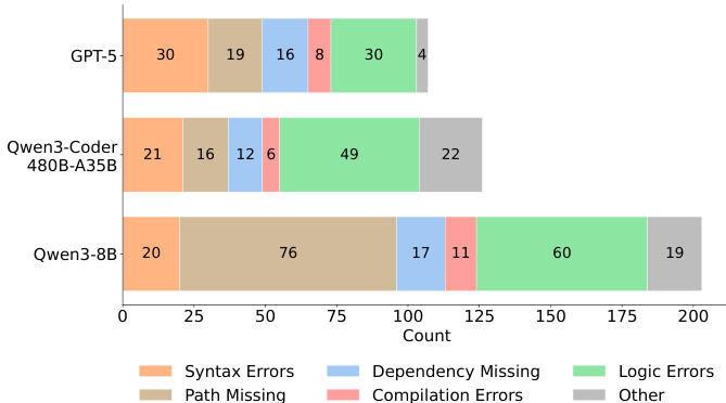 - Error analysis shows environment-related failures (e.g., Path Missing, Dependency Missing) dominate, especially for smaller models; larger models exhibit more Logic Errors, indicating a shift in failure mode from syntax to high-level reasoning.