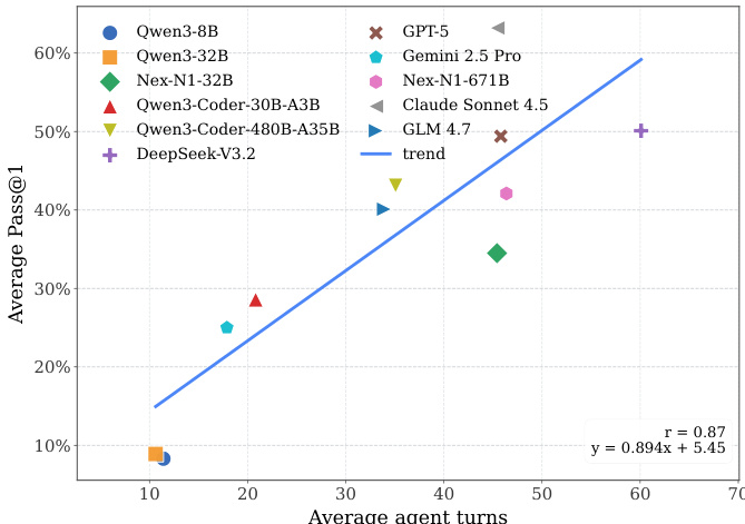 - Agentic post-training via supervised fine-tuning on Nex-N1 data boosts pass@1 from 8.3% to 13.9% (Qwen3-8B) and from 8.9% to 33.8% (Qwen3-32B), demonstrating the value of high-quality agentic training data.