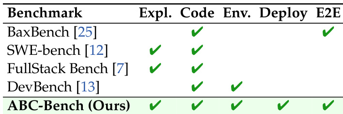 The authors introduce ABC-Bench, a benchmark that evaluates models on full-lifecycle backend tasks, including exploration, code generation, environment configuration, deployment, and end-to-end verification. Unlike existing benchmarks, ABC-Bench covers all these stages comprehensively, as demonstrated by the inclusion of all four phases—Exploration, Code, Environment, and Deployment—in its evaluation framework.