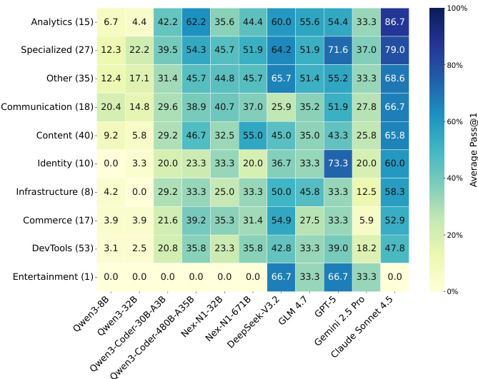 - Task category analysis reveals domain-specific challenges: DevTools tasks are consistently difficult (top model at 47.8%), while Analytics and Specialized tasks are easier (Claude Sonnet 4.5 at 86.7%).
