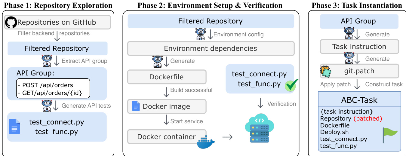 The authors leverage the ABC-Pipeline, an automated workflow designed to generate realistic backend development tasks at scale by transforming open-source repositories into full-lifecycle benchmark tasks. The pipeline operates in three distinct phases: Repository Exploration, Environment Setup & Verification, and Task Instantiation.