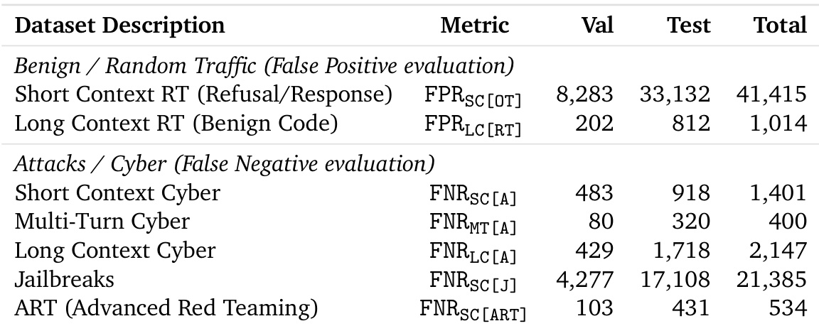 The authors use the table to detail the composition of their evaluation datasets, specifying the number of test and total samples for each dataset across different cyber and benign traffic categories. The table shows that the datasets vary significantly in size, with the Short Context RT (Refusal/Response) dataset having the largest test set at 33,132 samples, while the ART (Advanced Red Teaming) dataset has the smallest at 431 test samples.