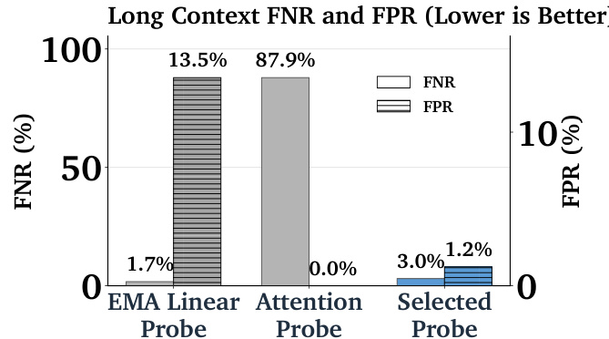 - Probes trained on short-context data matched or exceeded the performance of models trained on long-context data (2.38% vs. 2.53% test error), demonstrating that architectural improvements can overcome data limitations.