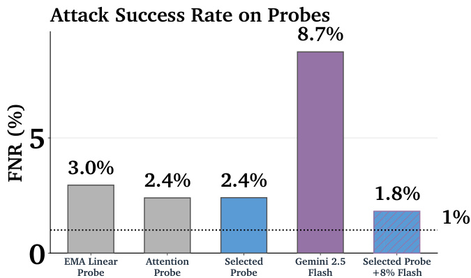 The authors use a bar chart to compare the false negative rates (FNR) of various probes and language models on adversarial attacks. Results show that the Gemini 2.5 Flash model has the highest attack success rate at 8.7%, significantly outperforming all probes. The Selected Probe achieves a 1.8% FNR, demonstrating that the best-performing probe still leaves a substantial vulnerability to attack, though it is much lower than the LLM's rate.