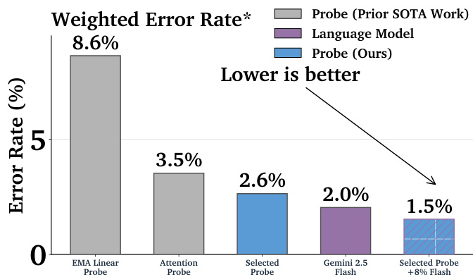 The authors compare the weighted error rates of different probe and language model classifiers, showing that their selected probe achieves a 2.6% error rate, which is lower than the 3.5% error rate of the attention probe and the 8.6% error rate of the EMA linear probe. The best-performing configuration, combining the selected probe with Gemini 2.5 Flash, reduces the error rate further to 1.5%, demonstrating significant improvements over prior methods.