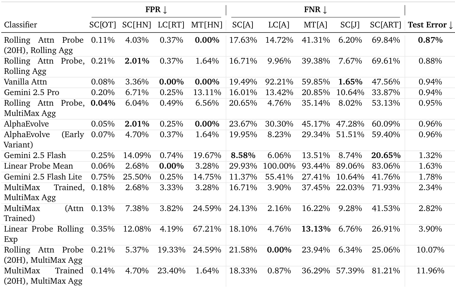 - On the main evaluation dataset, the Max of Rolling Means Attention Probe with MultiMax aggregation achieved a test error of 2.53%, surpassing the Linear Probe Mean (0.064 test loss) and outperforming all LLMs, with statistically significant gains confirmed via bootstrap resampling (Table 4).