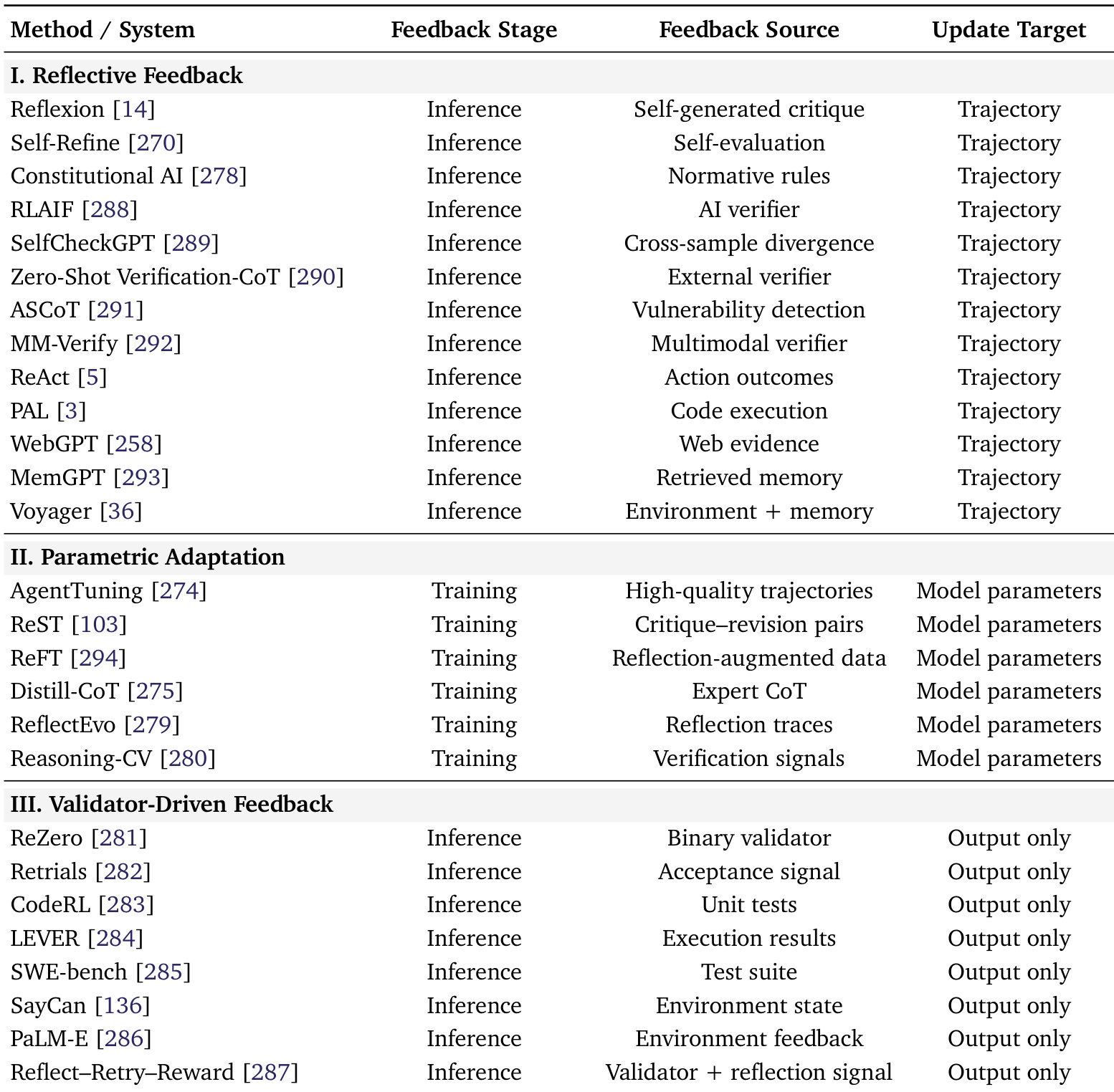 The authors use a table to categorize tool-use optimization systems into three feedback types: reflective, parametric adaptation, and validator-driven feedback. Results show that reflective methods primarily rely on inference-stage feedback from self-generated or external sources to update trajectories, while parametric adaptation and validator-driven methods focus on training-stage or inference-stage feedback to adjust model parameters or output only.