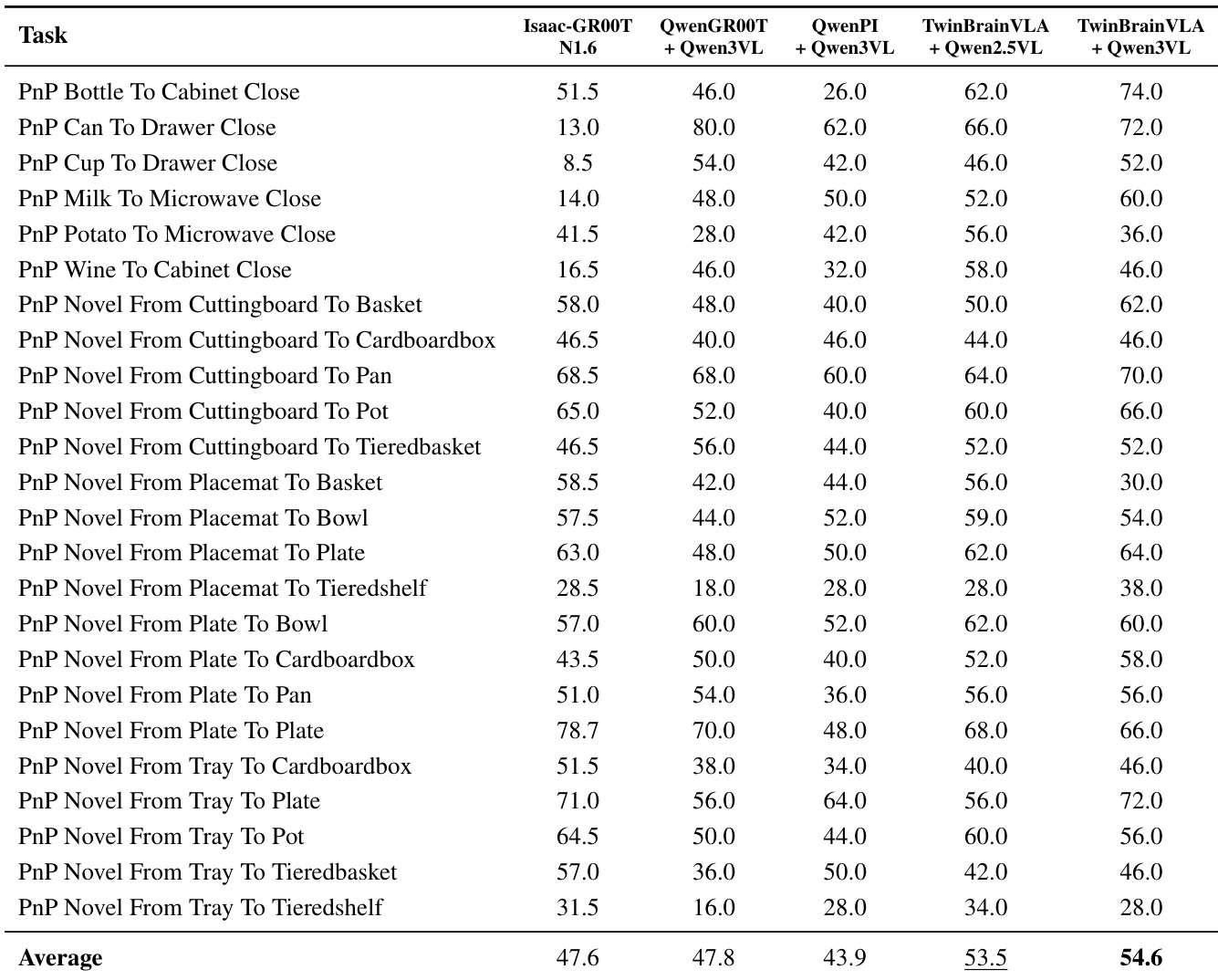 The authors use TwinBrainVLA with Qwen3-VL-4B-Instruct to achieve the highest average success rate of 54.6% on the RoboCasa GR1 Tabletop Benchmark, outperforming all baselines including Isaac-GR00T-N1.6 by 7.0 percentage points. Results show that the asymmetric dual-brain architecture enables superior performance in complex tabletop manipulation tasks compared to models trained with the same dataset and backbone.