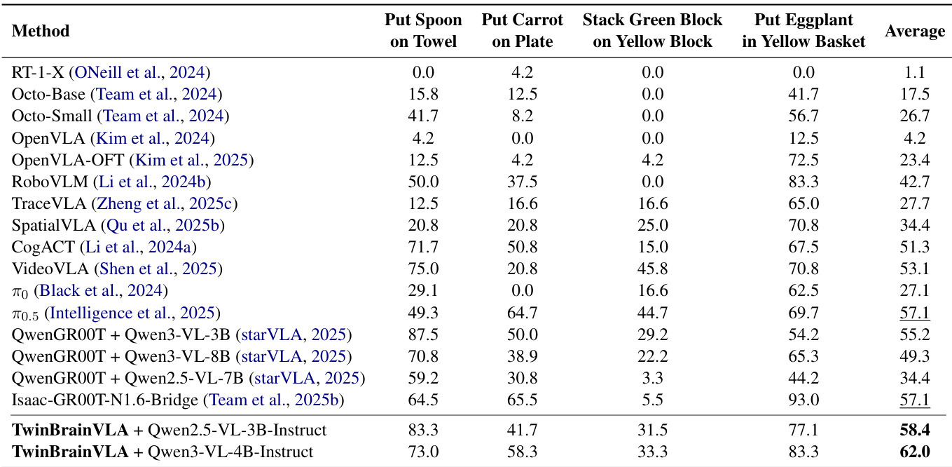 - On SimplerEnv with WidowX robot, TwinBrainVLA (Qwen3-VL-4B-Instruct) achieved 62.0% success rate across 4 tasks, surpassing Isaac-GR00T-N1.6 (57.1%) by +4.9%, validating asymmetric dual-brain design.