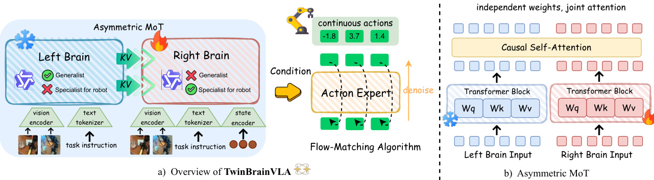 As shown in the figure below, the overall architecture of TwinBrainVLA features an asymmetric dual-stream design. The Left Brain processes only visual and textual inputs, receiving a sequence of image and text tokens derived from the vision encoder V(I) and text tokenizer T(T). This stream remains frozen during training, ensuring that its pre-trained semantic knowledge is preserved. In contrast, the Right Brain processes a multimodal input sequence that includes visual tokens, text tokens, and a projection of the robot's proprioceptive state s, encoded by a lightweight MLP state encoder ϕ. This design allows the Right Brain to ground its reasoning in the robot's physical configuration, a critical requirement for closed-loop control.