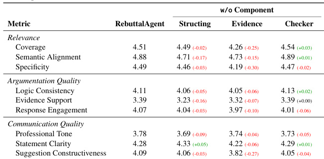 - Ablation study showed Evidence Construction is most critical—removing it caused largest drops in Relevance and Communication (Coverage: 4.51 → 4.26; Constructiveness: 4.09 → 3.82); Input Structuring and Checkers provided smaller but measurable improvements, confirming complementary module contributions.