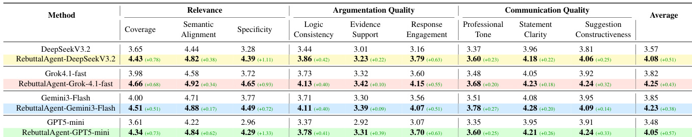 - Evaluated REBUTTALAGENT against SOTA LLMs (GPT-5-mini, Grok-4.1-fast, Gemini-3-Flash, DeepSeekV3.2) on RebuttalBench using a 0–5 LLM-as-judge rubric covering Relevance, Argumentation, and Communication Quality; REBUTTALAGENT consistently outperformed baselines across all dimensions, with largest gains in Relevance (+0.78 for DeepSeekV3.2, +1.33 for GPT5-mini) and Argumentation (+0.63), while Communication gains were smaller but consistent.