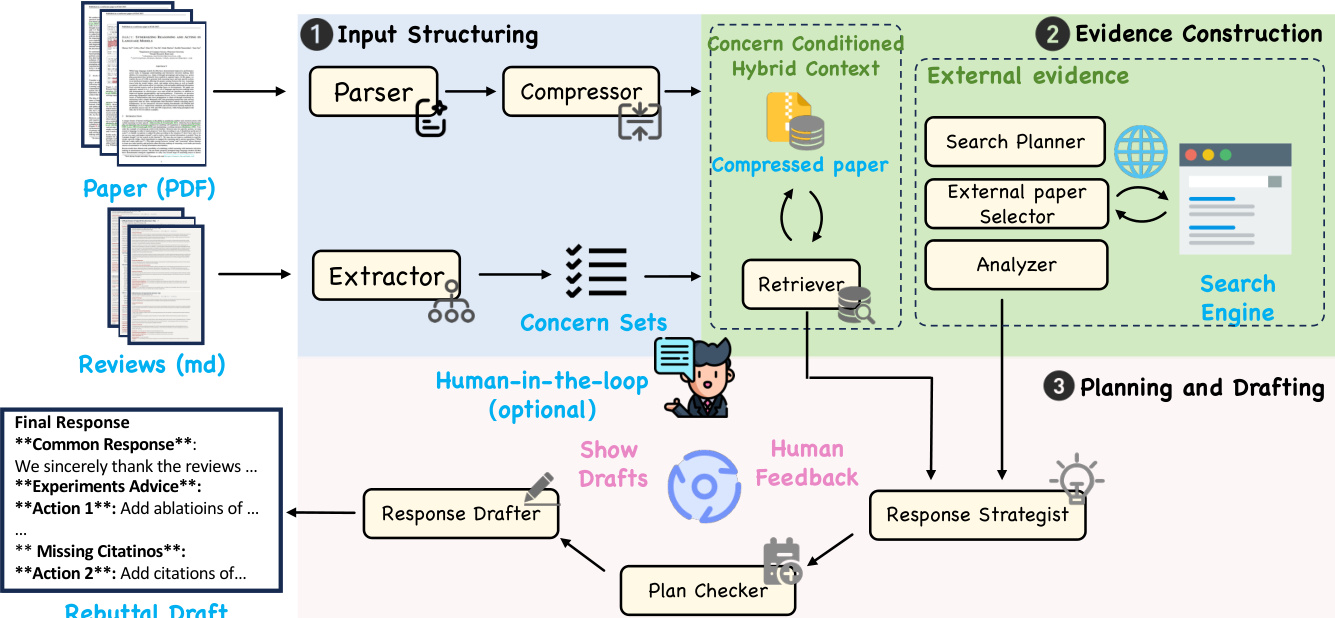 The pipeline begins with input structuring, where the raw manuscript and reviews are distilled into condensed representations optimized for downstream reasoning. A parser agent converts the manuscript PDF into a paragraph-indexed format to preserve structural integrity. A compressor agent then distills these paragraphs into a concise representation that retains essential technical statements and experimental results, serving as a navigational anchor for subsequent modules. To ensure fidelity, a consistency checker verifies each condensed unit against its source and triggers reprocessing if it detects missing claims or semantic drift. Concurrently, an extractor agent parses the raw review feedback into discrete and addressable atomic concerns, organizing critiques by grouping related sub-questions and assigning preliminary categories. A coverage checker validates the output for intent preservation and appropriate granularity, ensuring substantive points remain distinct without being over-split or incorrectly merged. The resulting structured list of atomic concerns forms the foundational unit for evidence gathering and response planning.