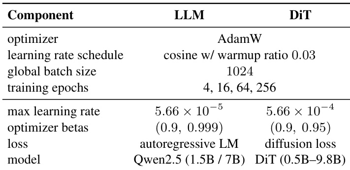 The authors use a consistent training setup for both LLM and DiT components, with the LLM trained using AdamW and a cosine learning rate schedule, while the DiT uses a diffusion loss and a higher learning rate. Training is conducted for 4, 16, 64, and 256 epochs with a global batch size of 1024, and the models include Qwen2.5 1.5B and 7B LLMs paired with DiT variants ranging from 0.5B to 9.8B parameters.