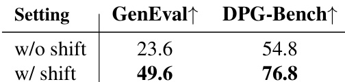The authors compare the impact of shift augmentation in the latent space during text-to-image diffusion training. Results show that applying shift augmentation significantly improves performance, increasing GenEval from 23.6 to 49.6 and DPG-Bench from 54.8 to 76.8, indicating that shift augmentation enhances both generation quality and alignment with human preferences.