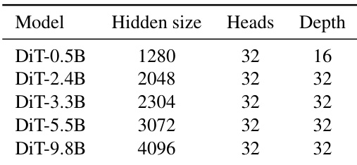 The authors compare DiT variants of different scales, showing that as the model size increases, the hidden size grows significantly while the number of heads and depth remain constant. This indicates that scaling DiT models primarily involves increasing the hidden dimension rather than altering the architecture's depth or attention heads.