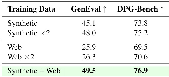 - Synthetic data + web data (49.5 GenEval) outperforms doubled synthetic (48.0), showing synergistic gains from complementary sources, not just volume.