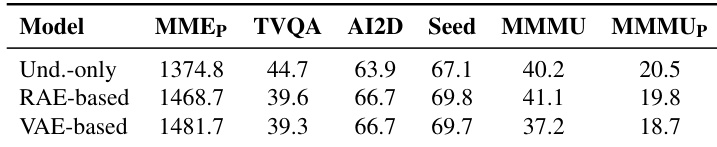 - Across 0.5B to 9.8B parameter DiT models, RAEs outperform FLUX VAEs in pretraining speed and quality, avoid catastrophic overfitting during finetuning, and enable unified multimodal reasoning by operating in a shared semantic latent space.