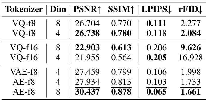The authors compare various tokenizers, including VQ and AE variants, and find that AE-f8 achieves the highest PSNR and SSIM while also yielding the lowest LPIPS and rFID scores, indicating superior reconstruction quality. Among the VQ-based tokenizers, VQ-f8 outperforms VQ-f16 in all metrics, suggesting that higher quantization levels improve reconstruction performance.