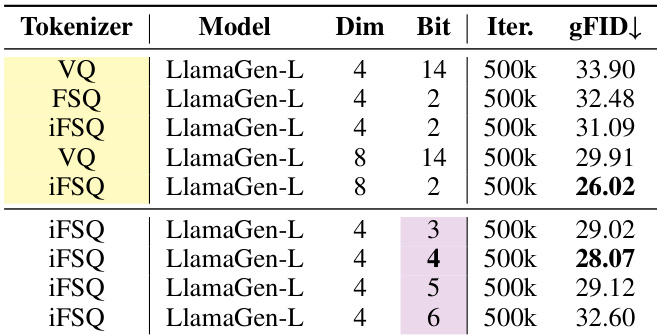 - For autoregressive generation (LlamaGen), iFSQ outperforms VQ at same latent dimension and lower bit rate; 4-bit iFSQ matches AE, with performance peaking at 4 bits.