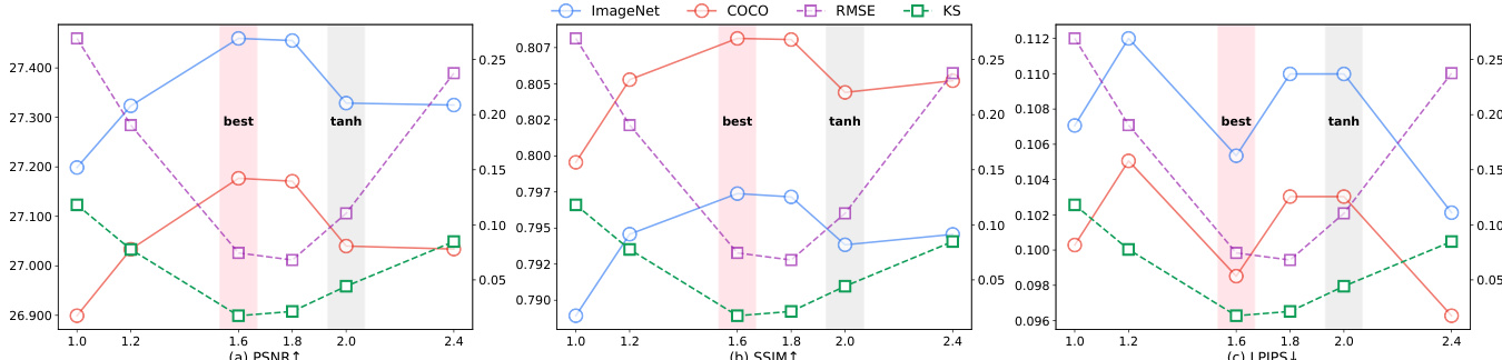 - Optimized iFSQ via α=1.6 in sigmoid-based activation achieves near-uniform output distribution, minimizing RMSE and KS metrics vs. tanh (α=2.0), improving reconstruction fidelity and entropy utilization.