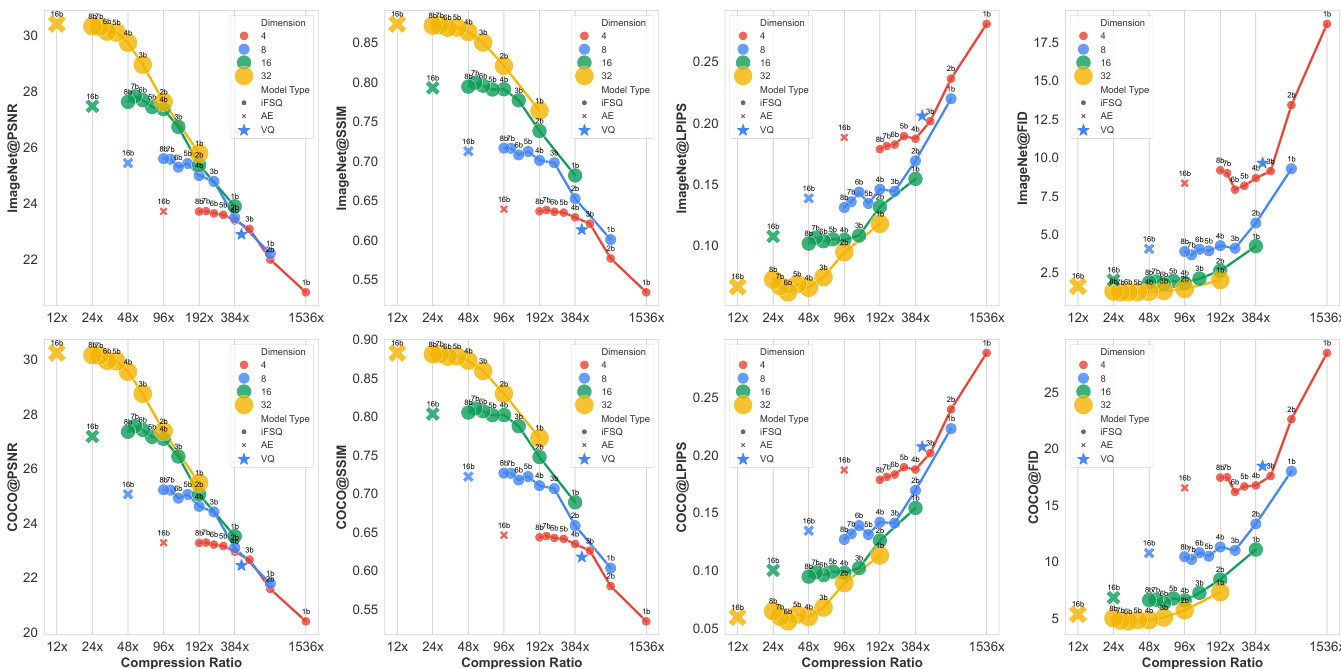- Compression ratio scaling (fig. 10) shows linear performance trend with optimal knee at ~48× compression (4 bits); VQ aligns closely with iFSQ trend, validating its hybrid discrete-continuous nature.