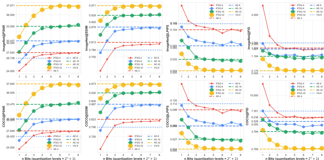 - Using iFSQ as a unified tokenizer, we establish a controlled benchmark revealing that 4 bits per dimension strikes the optimal balance between discrete and continuous representations, and that diffusion models outperform autoregressive models in final quality despite slower convergence.