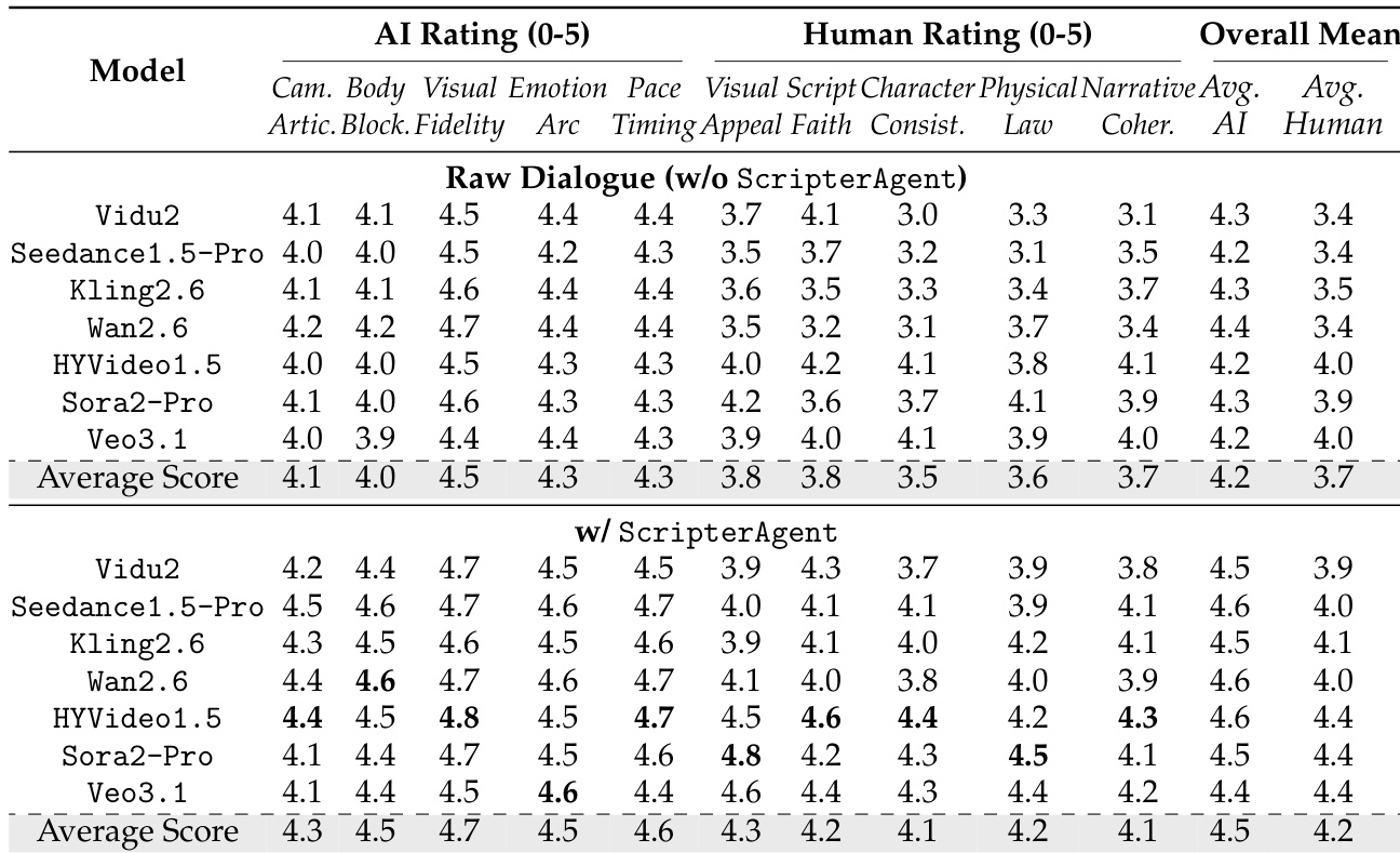 - Video generation assessed via CriticAgent, human raters, and novel VSA metric: Conditioning on ScripterAgent scripts lifts mean AI rating from 4.2 to 4.5 and human rating from 3.7 to 4.2; HYVideo1.5 leads in Script Faithfulness (4.6), Sora2-Pro in Visual Appeal (4.8).