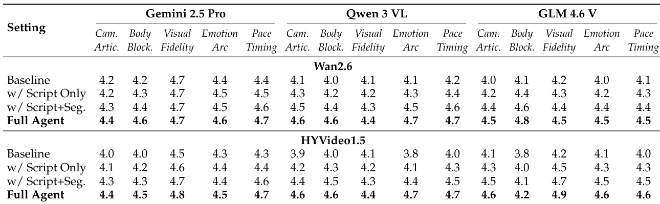 - Ablation shows Full Agent (script + segmentation + frame-anchoring) dominates: improves Narrative Pacing & Timing and Cinematic Camera Articulation; ScripterAgent alone boosts Visual Descriptive Fidelity and Body Blocking.