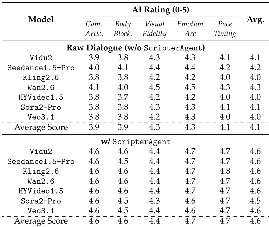 The authors use ScripterAgent to condition video generation models on structured scripts, resulting in significant improvements across all evaluated dimensions. Results show that the average AI rating increases from 4.1 to 4.6, with notable gains in Cinematic Camera Articulation, Kinetic Body Language, and Narrative Pacing, demonstrating that structured scripts enhance both technical execution and narrative coherence in generated videos.
