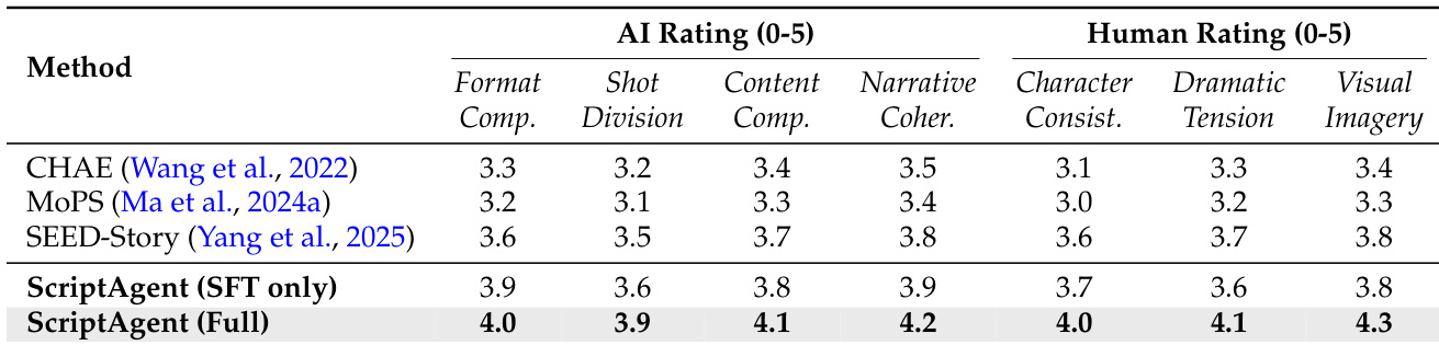 The authors use an evaluation framework to assess script generation methods, comparing ScriptAgent against baselines like CHAE, MoPS, and SEED-Story. Results show that ScriptAgent (Full) outperforms all baselines across both AI and human evaluation metrics, achieving the highest scores in Format Compliance, Content Completeness, Narrative Coherence, Character Consistency, Dramatic Tension, and Visual Imagery.