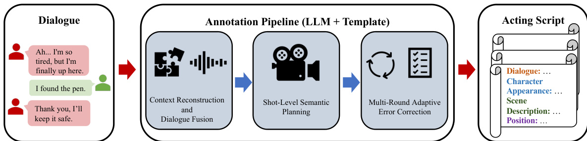 - Multi-Round Adaptive Error Correction — iteratively validates scripts via four modules: Dialogue Completeness, Character Appearance Consistency, Scene Coherence, and Positional/Physical Rationality.