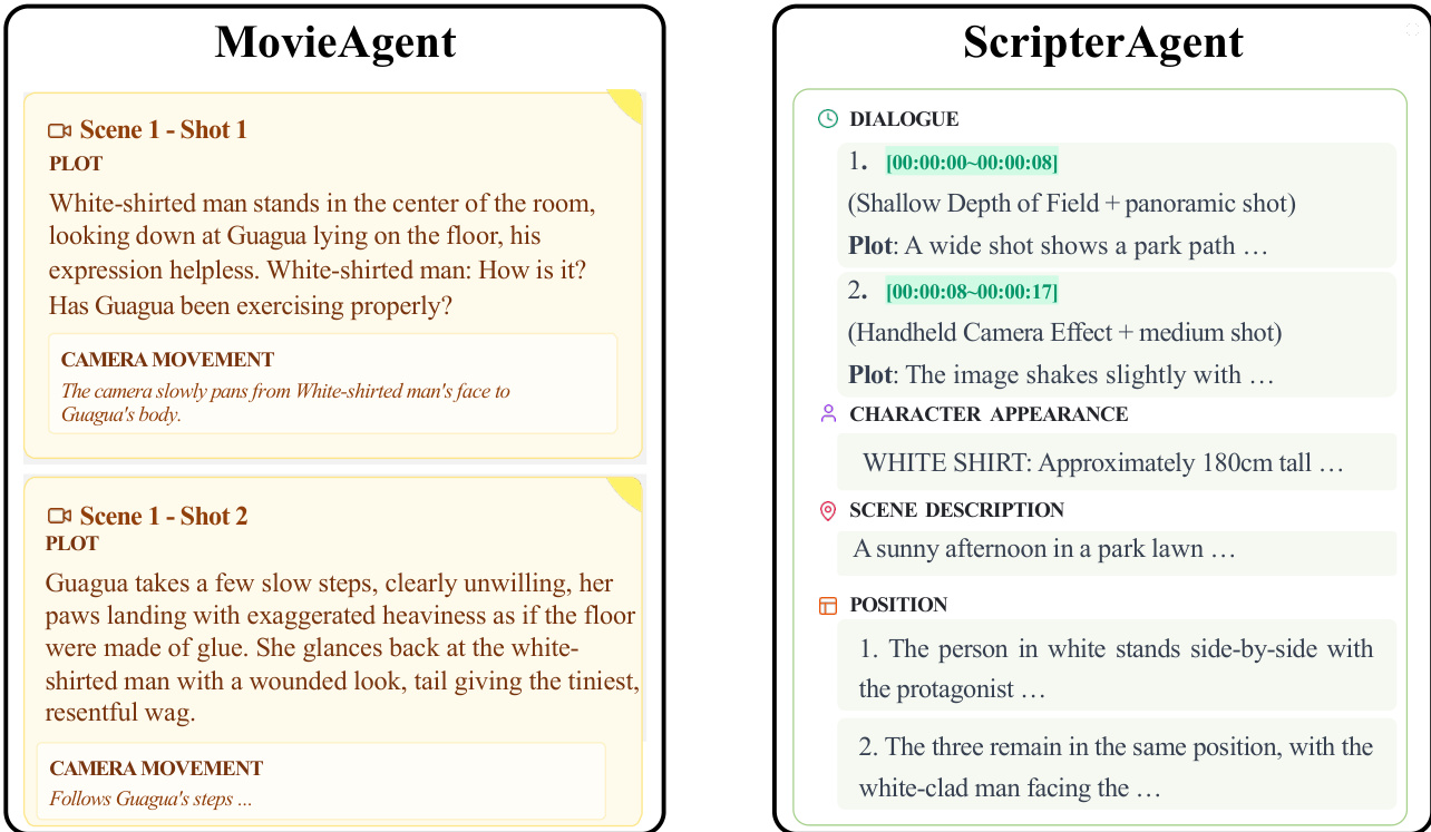 As shown in the figure below, the ScripterAgent takes a dialogue as input and produces a detailed acting script, which includes structured fields such as dialogue, character appearance, scene description, and position. This script serves as a blueprint for the subsequent video generation process.