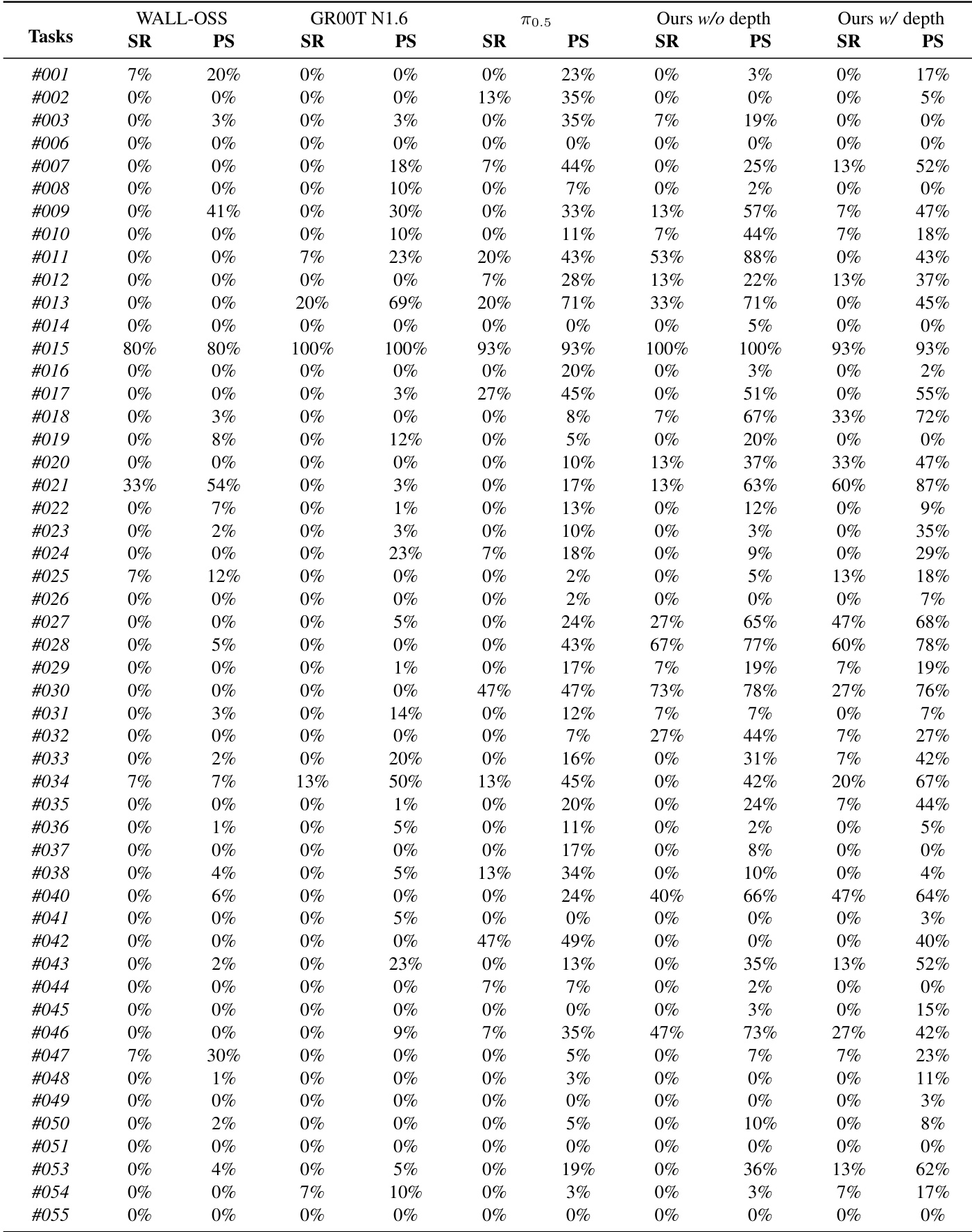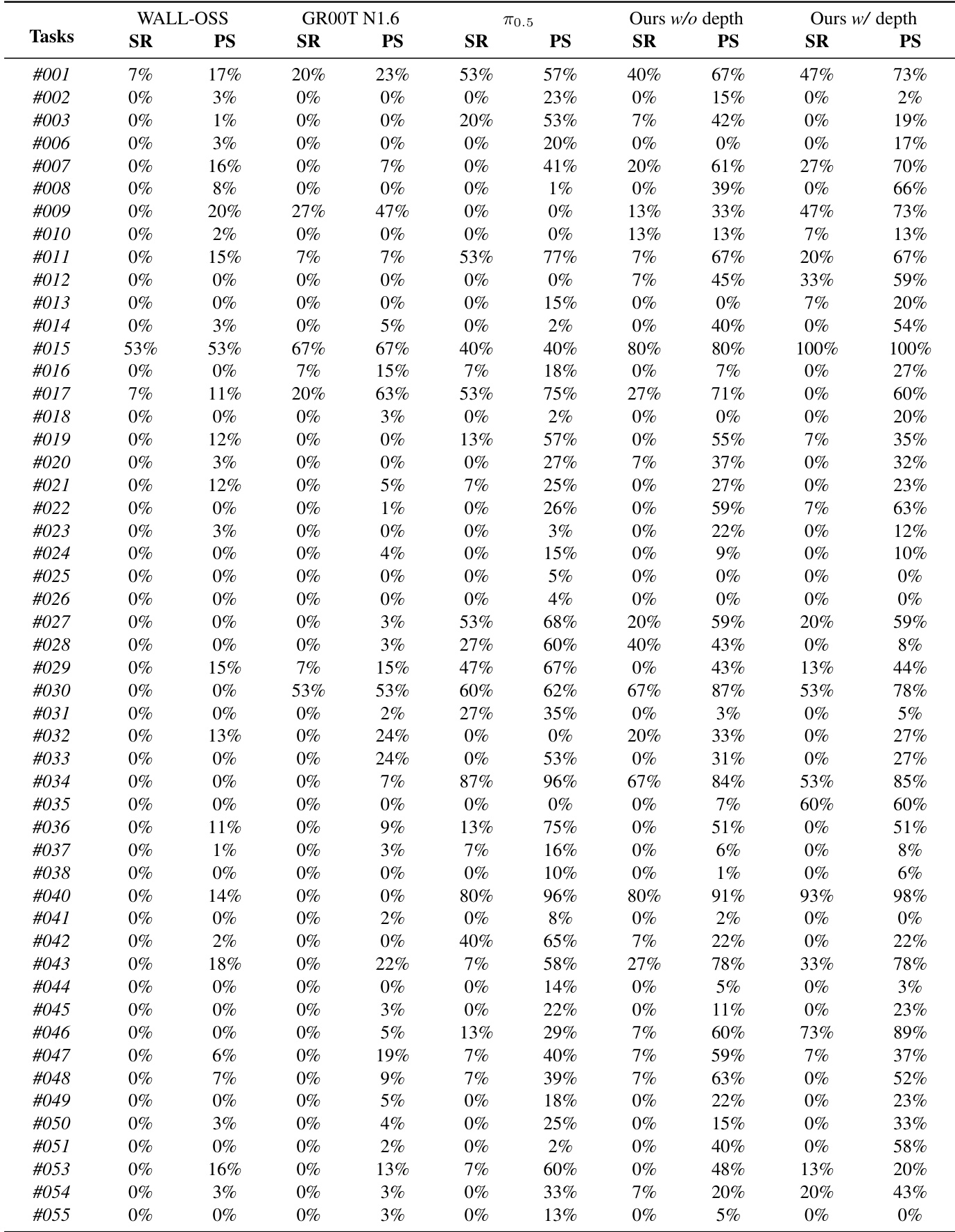 - On real-world GM-100, LingBot-VLA w/ depth outperformed π0.5 by +4.28% SR and +7.76% PS averaged across platforms; surpassed WALL-OSS and GR00T N1.6 consistently, with GR00T showing platform-specific gains due to pre-training alignment.