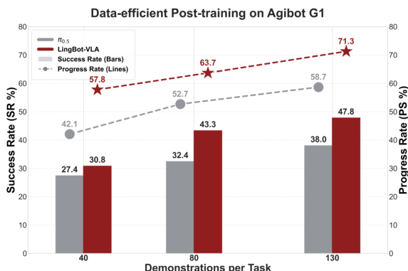- Data-efficiency tests on Agibot G1 showed LingBot-VLA with only 80 demos/task outperformed π0.5 using 130 demos/task, with performance gap widening as data increased.