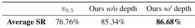 - In RoboTwin 2.0 simulation, LingBot-VLA w/ depth exceeded π0.5 by +5.82% SR (clean) and +9.92% SR (randomized), leveraging depth-enhanced spatial priors for robust multi-task generalization.
