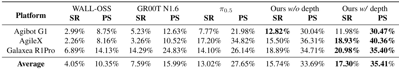 The authors use a large-scale real-world benchmark to evaluate LingBot-VLA against three state-of-the-art baselines across three robotic platforms, with results showing that LingBot-VLA without depth outperforms WALL-OSS and GR00T N1.6 in both success rate and progress score. By incorporating depth information, LingBot-VLA with depth achieves a 4.28% higher success rate and a 7.76% higher progress score than π₀.₅ across all platforms, demonstrating improved performance through enhanced spatial understanding.