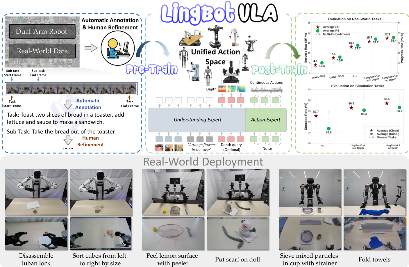 Robbyant researchers propose LingBot-VLA, a Vision-Language-Action foundation model trained on 20,000 real-world robot hours across 9 platforms, achieving state-of-the-art generalization via Mixture-of-Transformers and spatial-aware depth alignment, plus 1.5–2.8× faster training throughput, enabling scalable, deployable robotic manipulation.