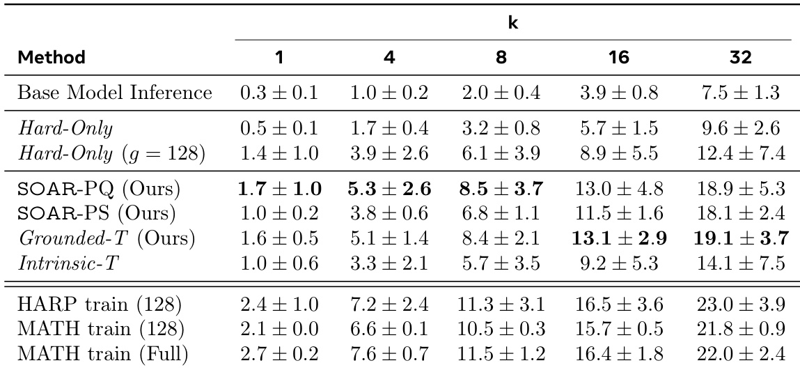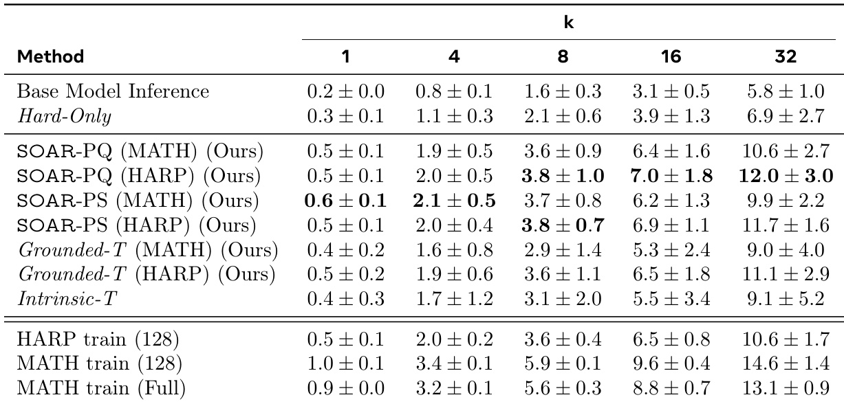 The authors use SOAR to generate synthetic questions that improve student performance on hard problem sets, with results showing that SOAR-PQ and SOAR-PS methods significantly outperform Hard-Only and Intrinsic-T baselines across all pass@k metrics. The best-performing methods, SOAR-PQ (MATH) and SOAR-PS (HARP), achieve pass@32 scores of 12.0 ± 3.0 and 11.7 ± 1.6 respectively, demonstrating that grounded meta-RL effectively discovers useful curricula that enable learning beyond performance plateaus.